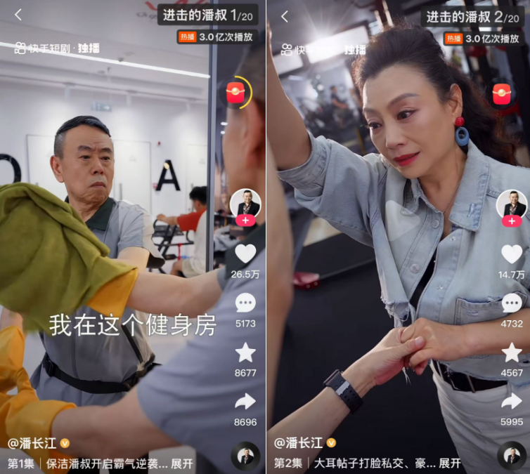 这部由美团冠名的20集短剧,播放量已突破3亿次。剧中,潘长江饰演健身房保洁员潘四喜,以一身正气拆穿教练卖课套路,还与《甄嬛传》中端妃扮演者李宜娟上演了一段"豪门阔太与保洁大叔"的黄昏恋,融合了中老年创业、健身房套路、替身文学等多重元素。