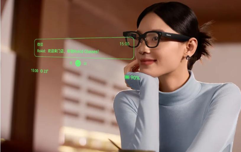 Rokid 于 2024 年 11 月与依视路子品牌 BOLON 联合发布了新一代 AI 智能眼镜 Rokid Glasses。该机采用高通骁龙 AR1 芯片、1200 万像素摄像头,整机重量仅 49 g,支持多模态大模型(通义千问、DeepSeek 等)实现实时翻译、拍照答题、声纹支付等功能。发布会后,Rokid CEO 祝铭明透露,双11期间全网销量突破 5000 万元,京东渠道销量同比增长 1000%,整体增长 800%。