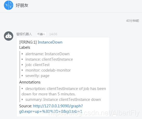 然后在 AlertManager 的配置里面,加入相应的 receiver(注意下面的 url)即可: