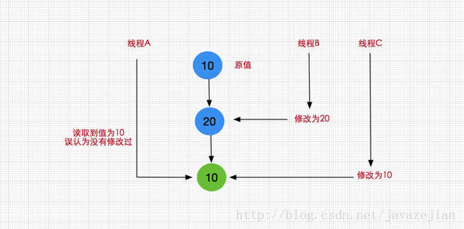 假设这样一种场景,当第一个线程执行CAS(V,E,U)操作,在获取到当前变量V,准备修改为新值U前,另外两个线程已连续修改了两次变量V的值,使得该值又恢复为旧值,这样的话,我们就无法正确判断这个变量是否已被修改过,如下图