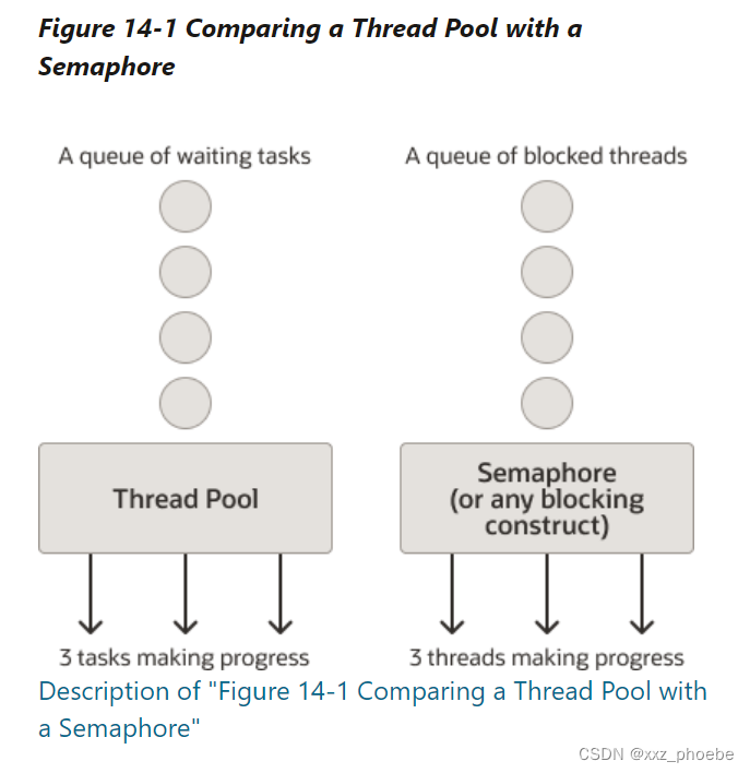 简单地用信号量阻塞一些虚拟线程似乎与将任务提交到固定线程池有很大不同,但事实并非如此。将任务提交给线程池会使它们排队等待稍后执行,但信号量在内部(或任何其他阻塞同步结构)创建一个被阻塞的线程队列,该队列反映了等待池线程执行它们的任务队列。由于虚拟线程是任务,因此生成的结构是等效的: