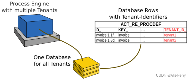 多租户可以通过一个使用租户标识符(即租户 ID)的流程引擎来实现。所有租户的数据都存储在一个表(相同的数据库和Schema)中。隔离通过存储在列中的租户标识符实现。