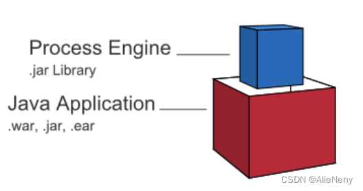 流程引起被作为一个组件或库,添加/集成到一个自定义程序中,通过这种方式,流程引擎可随应用程序生命周期进行管理,同时,也可以在共享数据库之上运行多个嵌入式流程引擎。