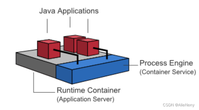 流程引擎在运行时容器(Servelt容器、ApplicationServer等)内启动。流程引擎作为容器提供服务,可以被部署在容器内部的所有程序共享。这个概念可以类比JMS消息队列,它由运行时提供,可以被所有应用程序使用。流程部署和应用程序之间存在一对一的映射:流程引擎跟踪应用程序部署的流程定义,并将执行委托给相关应用程序。