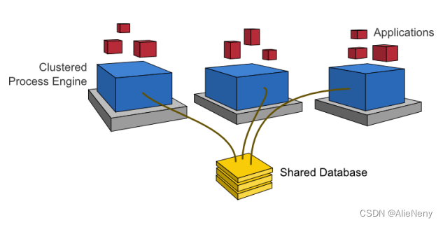 流程引擎可以在同一台服务器上运行,以便所有流程引擎共享相同的计算资源,例如数据源(通过Schema或表隔离时)或用于异步作业执行的线程池。