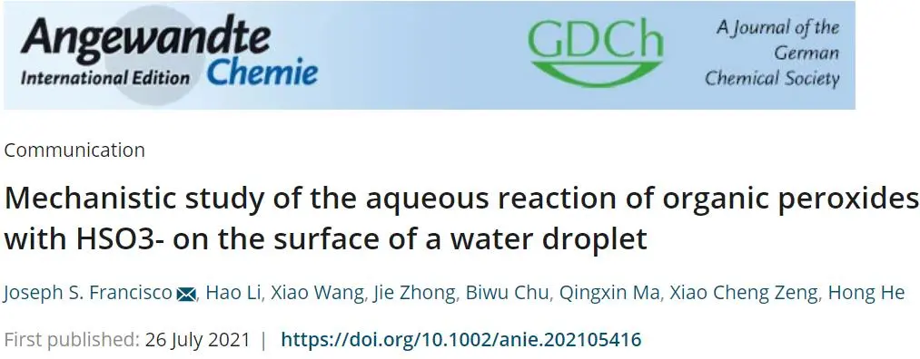 Angew:有机过氧化物与HSO3-在液滴表面的水反应机理研究