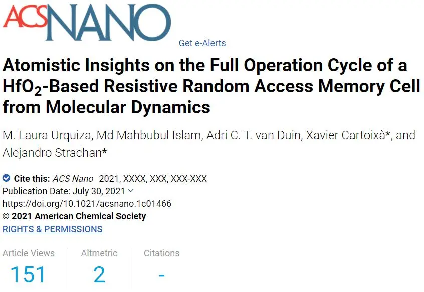 M. Laura Urquiza, Md Mahbubul Islam, Adri C. T. van Duin, Xavier Cartoixà, and Alejandro Strachan. Atomistic Insights on the Full Operation Cycle of a HfO2-Based Resistive Random Access Memory Cell from Molecular Dynamics.ACS Nano Article ASAP DOI: 10.1021/acsnano.1c01466