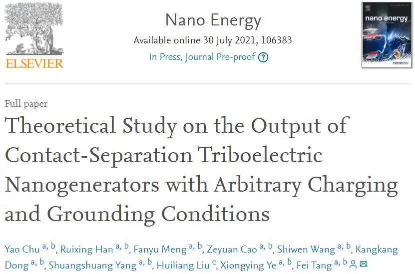 Yao Chu, Ruixing Han, Fanyu Meng, Zeyuan Cao, Shiwen Wang, Kangkang Dong, Shuangshuang Yang, Huiliang Liu, Xiongying Ye and Fei Tang, Theoretical Study on the Output of Contact-Separation Triboelectric Nanogenerators with Arbitrary Charging and Grounding Conditions,Nano Energy, (2021) doi:https://doi.org/10.1016/j.nanoen.2021.106383