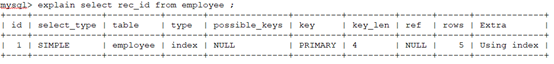 上面可以看出,根据no列排序的连接类型是all型的,但是注意extra列是用到了排序(Using filesort),而根据rec_id列排序的连接类型是index,而且得到的结果自然是有序的,不许额外的排序。可能正是因为这个缘故,index的效率比all高,但注意这需要相同的条件才成立(既需要排序)。