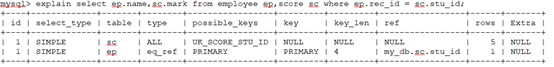 上面就可以看到score表是全表扫描的类型,rows=5代表外层表循环了五次(因为有五条数据),但是employee表的rows怎么是1,怎么可能?刚开始也是很疑惑,这与mysql的查询原理息息相关,rows实际反映的是查询的内循环数,针对外层的每一条数据匹配,employee的确一枪就可以命中,因此rows为1。