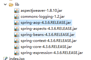 1.首先要有被切入对象,创建包,在包下创建对应的实现类,这里需要再spring基础jar包,和依赖包的基础之上,添加spring-aspects-4.3.6.RELEASE.jar和aspectjweaver-1.8.10.jar。
