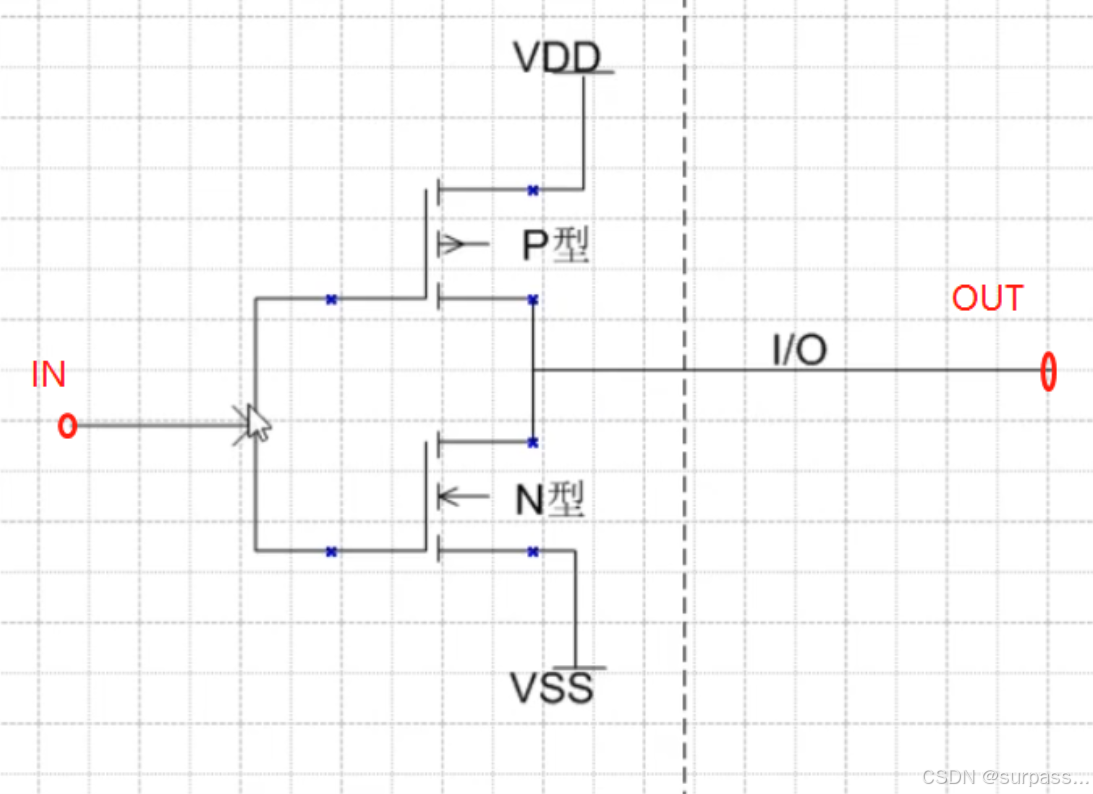 当IN输入高电平时,N-MOS导通,P-MOS截止,此时OUT输出的电压是VSS,低电平;