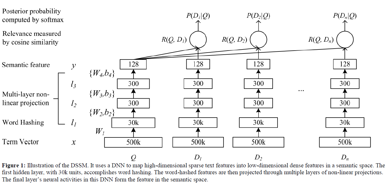 潜在语义模型,比如LSA,打算在基于关键词匹配经常失败的语义级别上将查询映射到其相关的文档。在该研究中,我们努力开发了一系列基于深层结构的新的潜在语义模型,该模型将queries和documents映射到一个公共的低维空间中,在该低维空间中,被给定的query和一个document的相关性是很容易通过它们之间的距离计算得到。本文提出的深度结构语义模型通过使用点击数据最大化给定query的情况下被点击的文档的条件似然估计进行判别训练。