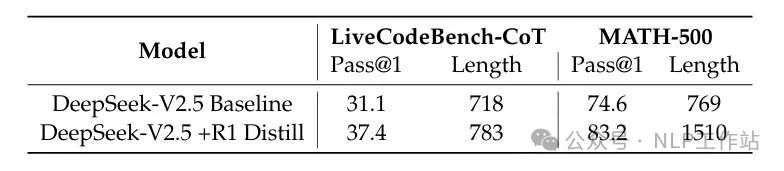报告基于DeepSeek-V2.5研究了从DeepSeek-R1蒸馏的贡献。DeepSeek-R1 Distill在LiveCodeBench和MATH-500基准测试中取得了显著提升。