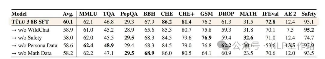 多样化对话数据(WildChat),对大多数技能有积极影响,特别提升Alpaca Eval性能。
