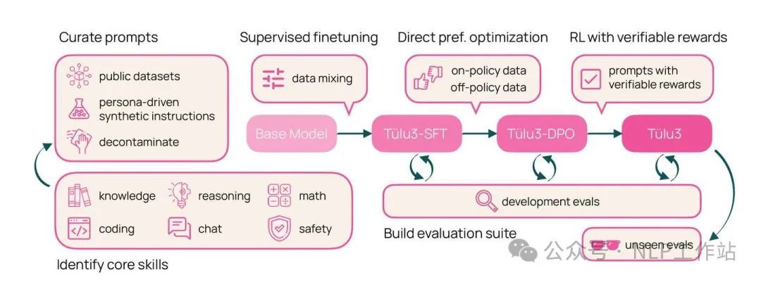 TÜLU 3的后训练路径是SFT->DPO->RLVR。TÜLU 3报告写的还是非常有诚意的,RL部分提供了蛮多细节供学习。也是印象中少有的花了比较大篇幅讲RLVR的一篇报告。