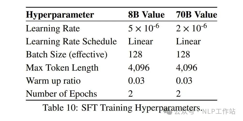 batch size 128,Max Length 4096,Linear LR。对于8B模型,学习率:5e-6。对于70B模型,学习率:2e-6。训2个epoch。