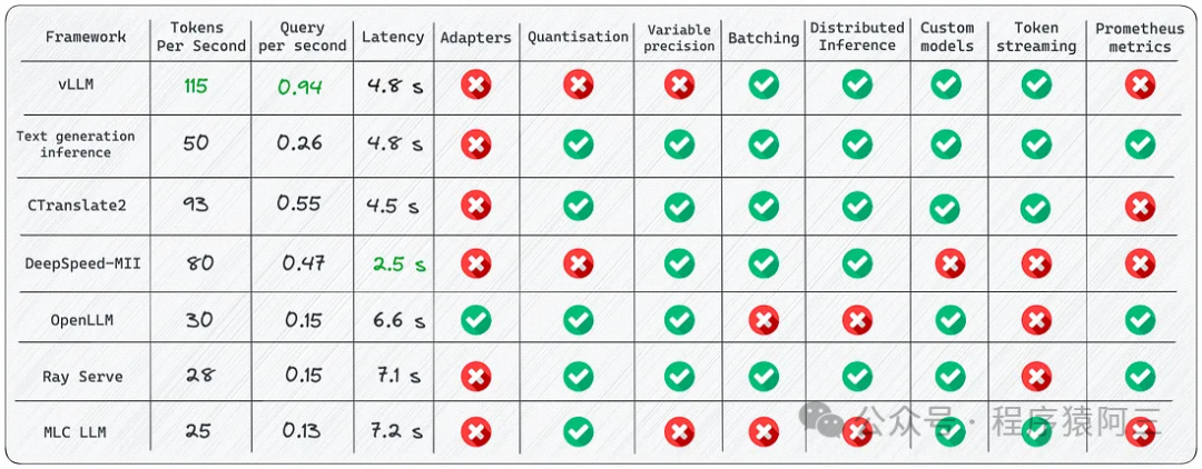 上面列出那么多推理框架,是不是被搞懵逼了,虽然从文字说明各个推理框架优缺点,但是依然显得有些干涩. 国外有些伙伴从不同维度对比了各个主流(不是上面的全部)推理框架, 方便大家快速理解,不同框架的优势和劣势, 其中vLLM在Tokens吞吐量优势明显。