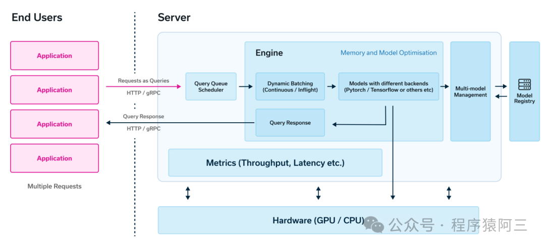 Ray Serve:Ray Serve是一个可扩展的模型服务库,用于构建在线推理API。Serve与框架无关,因此可以使用一个工具包来为深度学习模型的所有内容提供服务。 | * 文档支持:开发人员几乎为每个用例撰写了许多示例; * 支持生产环境部署:这是本列表中所有框架中最成熟的; * 本地LangChain集成:您可以使用LangChian与远程Ray Server进行交互; | * 缺乏内置的模型优化:Ray Serve不专注于LLM,它是一个用于部署任何ML模型的更广泛的框架,必须自己进行优化; * 入门门槛高:该库功能多,提高了初学者进入的门槛; |