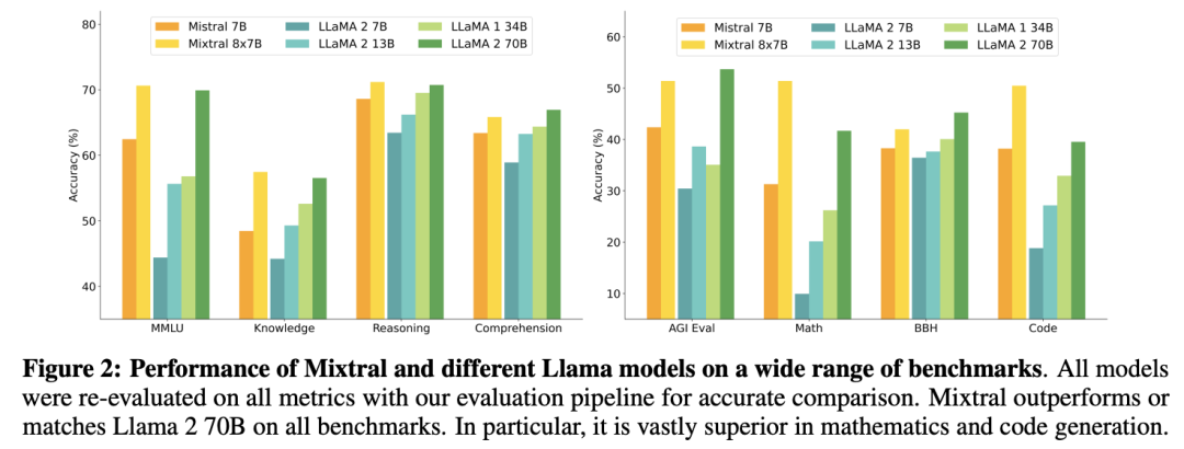 - Mixtral 8x7B :由Mistral AI发布的开源模型,其以约13B的激活参数,在众多基准测试中击败了拥有70B参数的Llama 2 70B模型,成为开源社区的标杆。