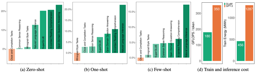 - GLaM:同样来自Google的GLaM模型,虽然总参数量高达1.2T,但其推理成本仅为GPT-3 (175B)的三分之一,却在多项零样本(Zero-shot)NLP任务上取得了更优异的成绩。