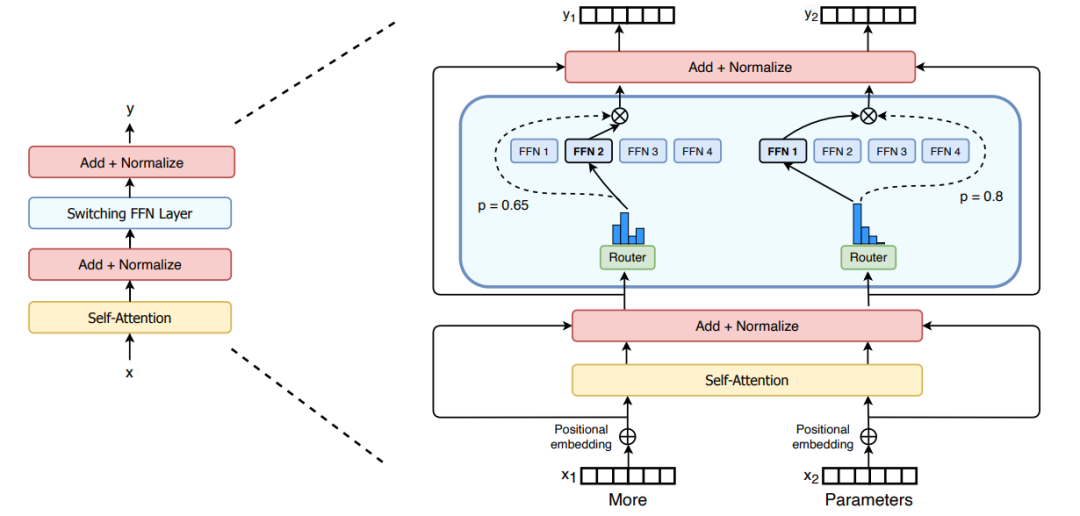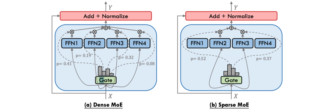 在MoE摸型中,**“专家”负责学习并处理不同的信息,而”路由器”**则负责根据输入智能地选择最合适的专家进行处理,并将选定专家的输出作为最终输出。
