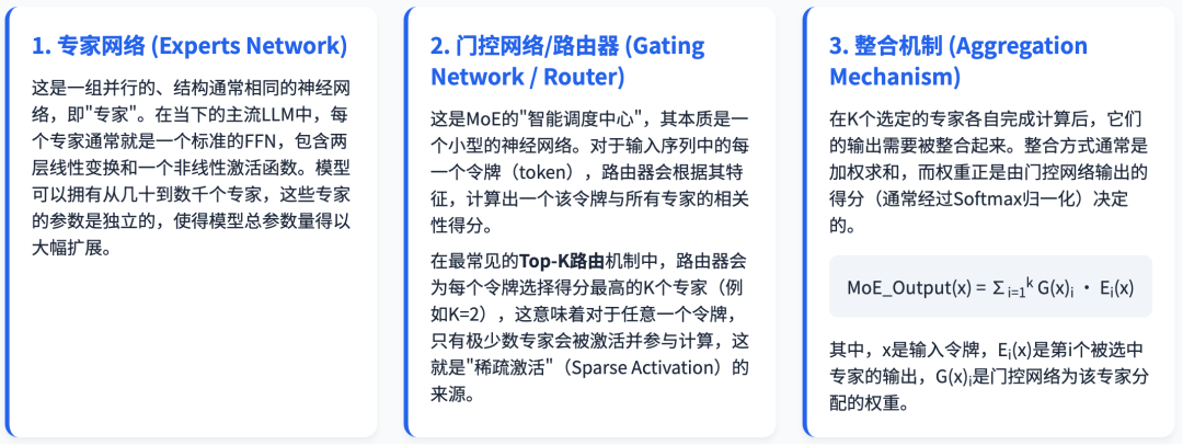 MoE架构并非单一固定的设计,但其核心组件和工作流程具有共通性。一个典型的MoE层通常嵌入在Transformer架构中,用于替代其中的前馈网络(Feed-Forward Network, FFN)层。