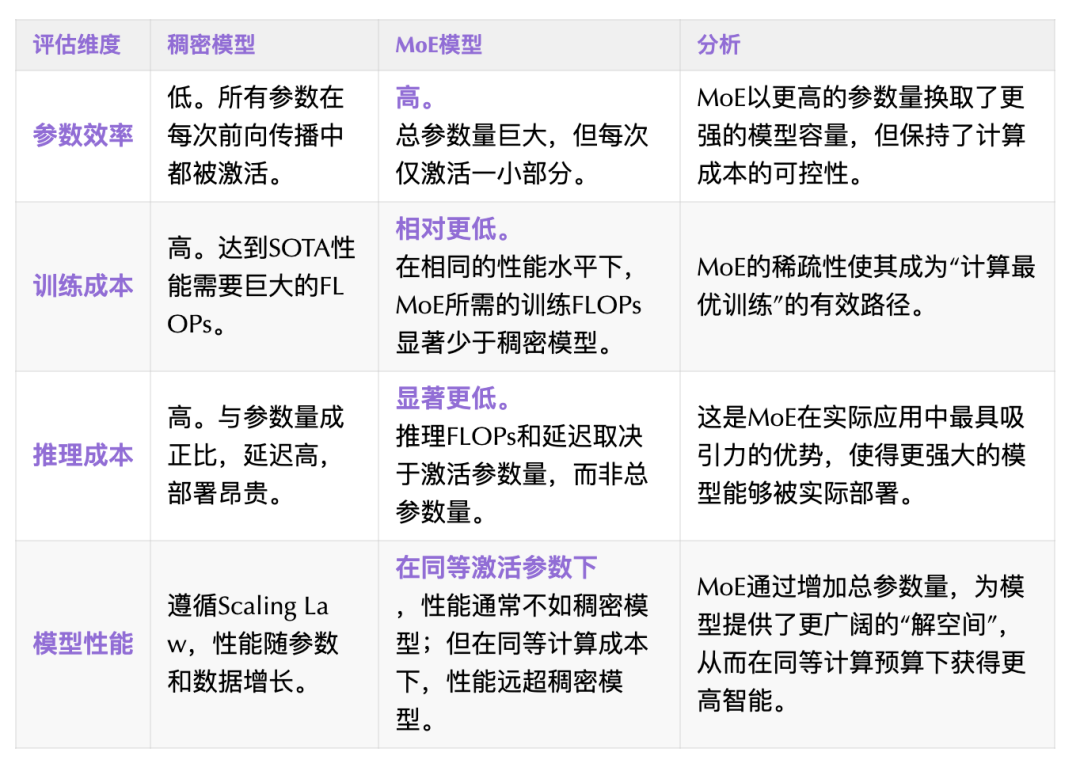 MoE模型的核心价值是在相似甚至更低的计算成本下,达到或超越更大规模的密集模型的性能。