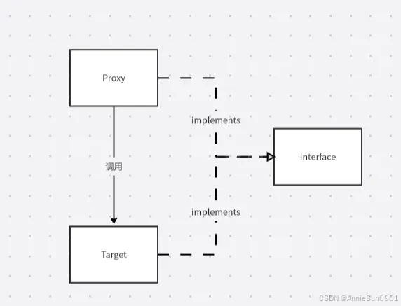 JDK代理只能生成接口的代理,因此,想要代理的对象必须至少实现一个接口,并且生成的代理将是实现该接口的对象,示意图如下: