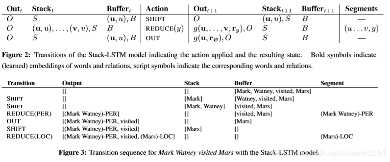 2. Stack LSTM:源序列(一段文本)输入到LSTM中,然后输出每个单词对于各种操作(SHIFT, REDUCE(y), OUT)的概率分布。通过贪心算法选择一个序列最有可能的操作,根据操作对源序列进行标注。例子同上:
