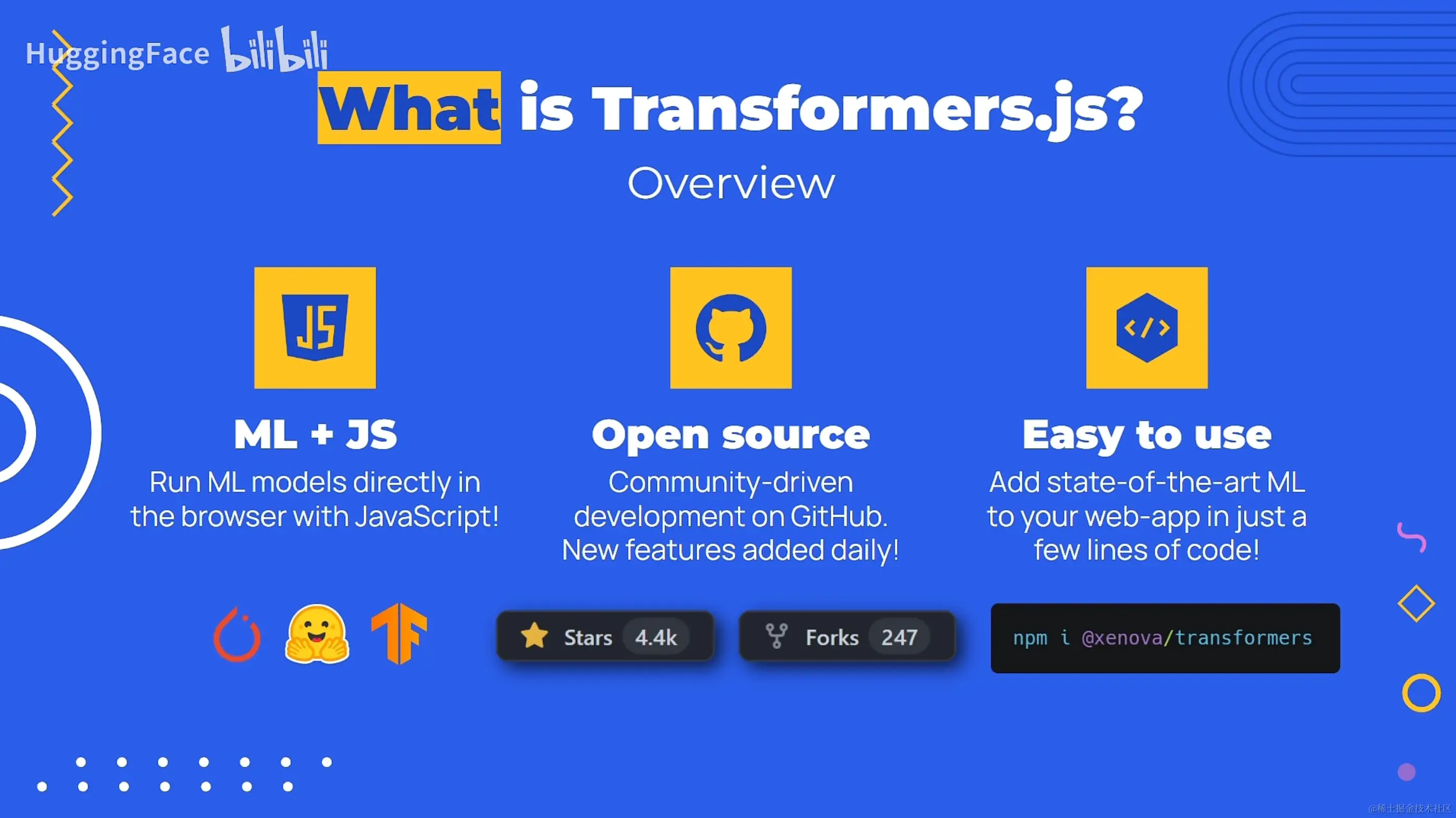 Transformers.js 是 Hugging Face 官方支持的 JavaScript 版 Transformers 库,由社区贡献者 @Xenova 主导开发。
