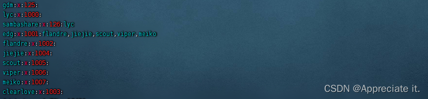 各用户组中,是以":"作为字段之间的分隔符,分为4个字段