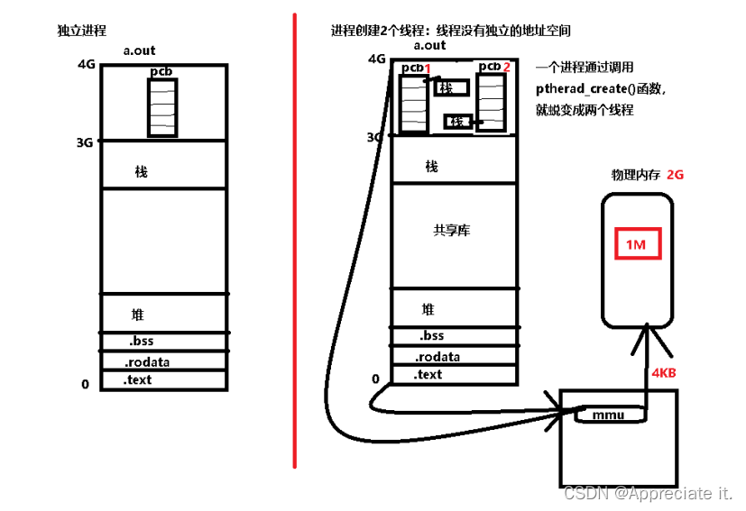 但是线程不同,两个线程拥有各自独立的PCB,但共享一个页目录,也就共享同一个页表和物理页面。所以两个PCB共享一个地址空间