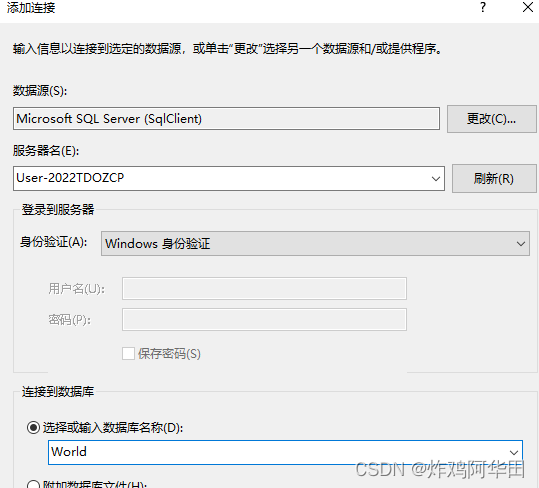 String sqlconn = " Data Source=User-2022TDOZCP;Initial Catalog=World;Integrated Security=True";