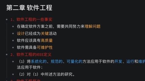 软件工程第一章 软件的本质 1、什么是软件? (1)指令的集合(计算机程序),通过执行这些指令可以满足预期的特性、功能和性能的需求; (2)数据结构,使得程序可以合理利用信息; (3)软件描述信息 documentation,描述程序的操作和使用。 软件是开发或设计的,不是传统意义上的制造 软件不会“磨损” 尽管行业正在向基于组件的构建方向发展,但大多数软件仍然是定制的。 2、软件失效曲线图 已增长的失效曲线取决于旁边的效率 3、软件应用领域 (1)系统软件 (2)应用软件 (3)工程/科学软件 ..