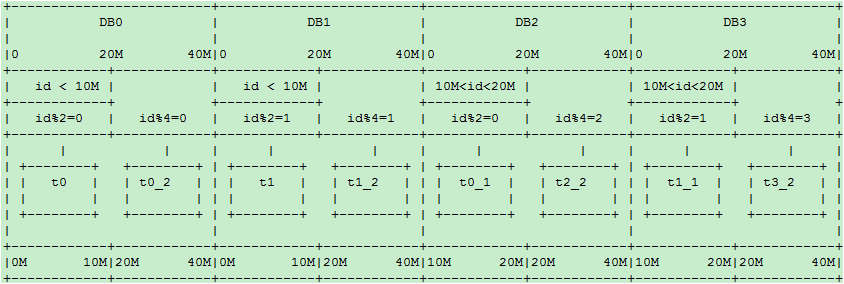 这样 10M 以后的新生数据会均匀分布在 DB0 和 DB1; 插入更新和查询热点仍然能够在每个库中均匀分布。每个库中同时有老数据和不断增长的新数据。每表的数据仍然控制在 500万 以下。