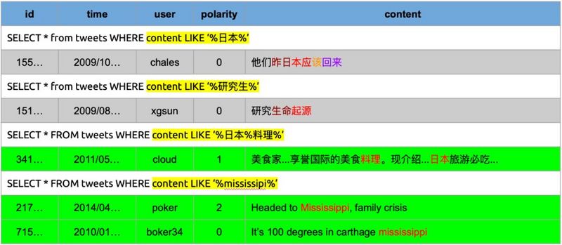 当前我们正逐步将越来越多的业务数据向 TiDB 迁移,目前在 TiDB 上我们只能使用 SQL Like 对内容进行简单的检索。但即便不考虑性能问题,SQL Like 仍然无法实现一些在搜索场景下常见的信息检索需求,例如下图所示的几种场景,单纯使用 Like 会导致查询到有歧义的结果或满足搜索条件的结果无法返回。