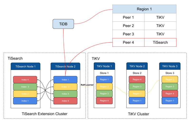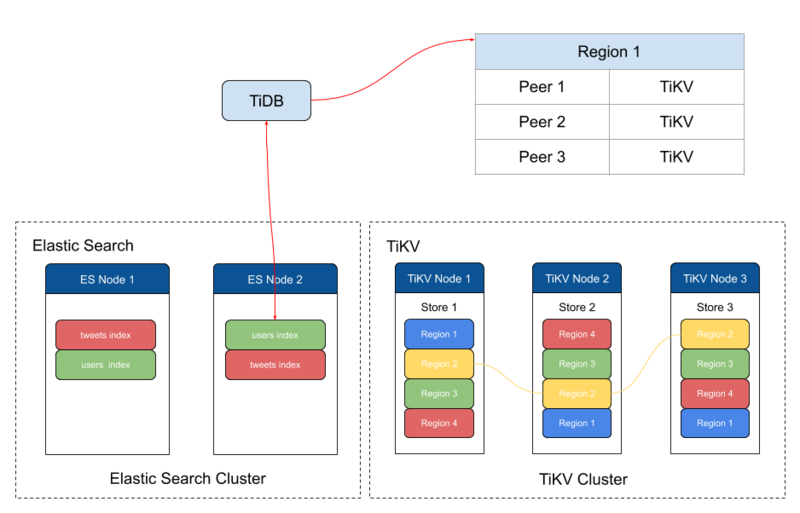 架构如上图所示,TiDB 作为 ES 和 TiKV 之间的桥梁,所有同 ES 的交互操作都嵌入在 TiDB 内部直接完成。