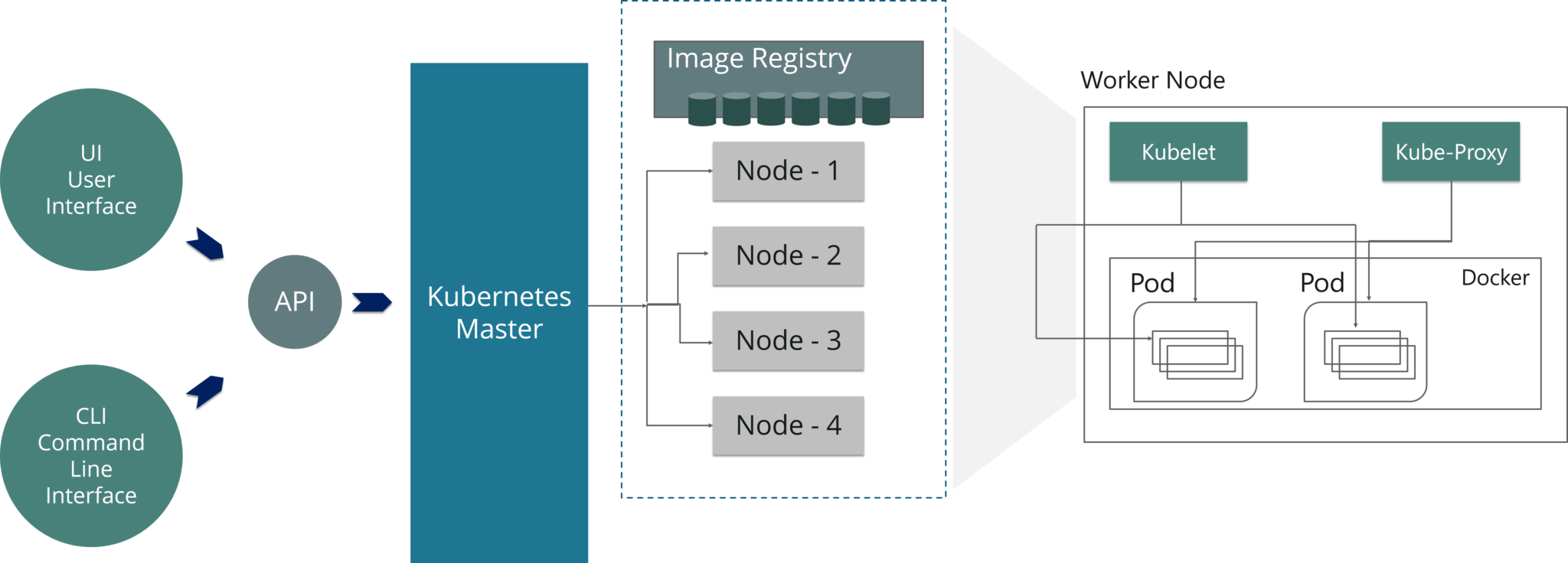 如上图所示,worker节点有各种组件,如Docker Container,Kubelet,Kube-proxy和Pods。