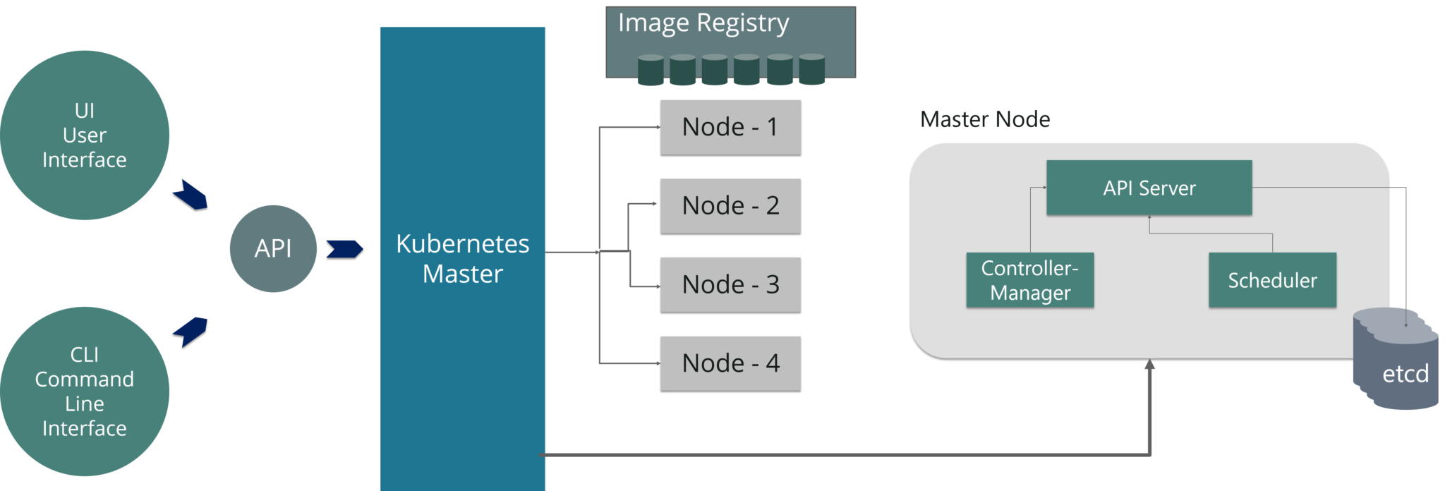 如上图所示,主节点具有各种组件,如API服务器,控制器管理器,调度程序和ETCD。