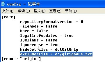 通过.git/config配置文件的core. Excludesfile选项,指定一个忽略规则文件(完整路径),如下图所示。忽略规则在文件e:/gitignore.txt中(当然该文件名可以任意取)。