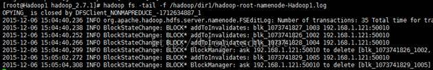hadoop fs -tail -f/hadoop/dir1/hadoop-root-namenode-Hadoop1.log