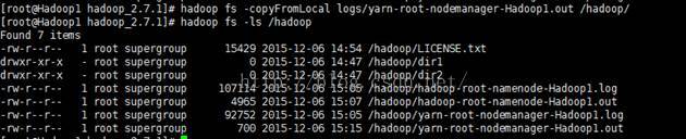 hadoop fs -putlogs/hadoop-root-namenode-Hadoop1.log logs/yarn-root-nodemanager-Hadoop1.log/hadoop/