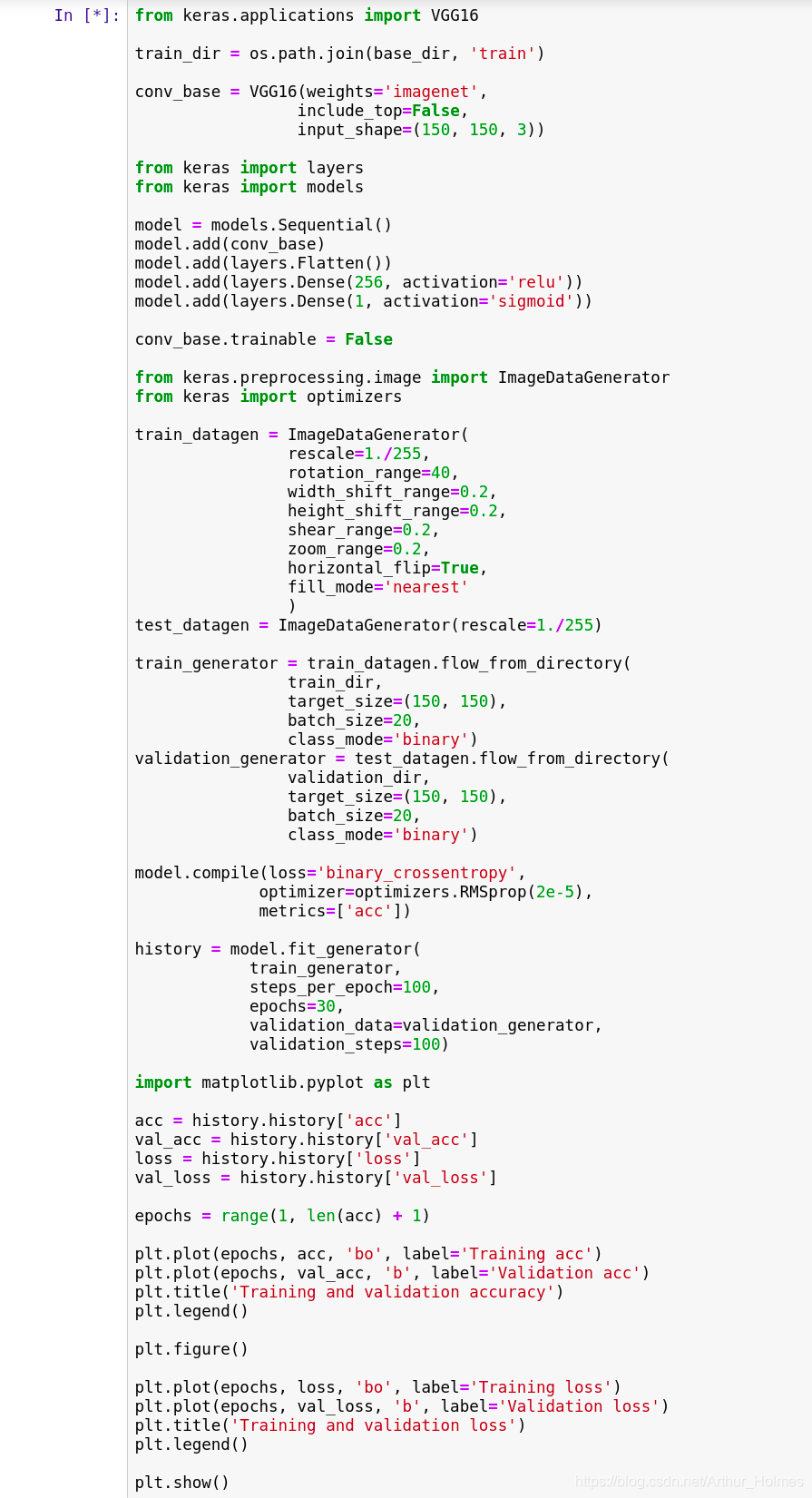 Found 1998 images belonging to 2 classes. Found 1000 images belonging to 2 classes. Epoch 1/30 100/100 [==============================] - 63s 627ms/step - loss: 0.5820 - acc: 0.7119 - val_loss: 0.4467 - val_acc: 0.8220 Epoch 2/30 100/100 [==============================] - 62s 622ms/step - loss: 0.4714 - acc: 0.7957 - val_loss: 0.3649 - val_acc: 0.8550 Epoch 3/30 100/100 [==============================] - 63s 630ms/step - loss: 0.4236 - acc: 0.8173 - val_loss: 0.3235 - val_acc: 0.8760 Epoch 4/30 100/100 [==============================] - 63s 630ms/step - loss: 0.4076 - acc: 0.8164 - val_loss: 0.3093 - val_acc: 0.8780 Epoch 5/30 100/100 [==============================] - 63s 626ms/step - loss: 0.3893 - acc: 0.8309 - val_loss: 0.2969 - val_acc: 0.8770 Epoch 6/30 100/100 [==============================] - 62s 625ms/step - loss: 0.3626 - acc: 0.8383 - val_loss: 0.2825 - val_acc: 0.8820 Epoch 7/30 100/100 [==============================] - 62s 625ms/step - loss: 0.3753 - acc: 0.8383 - val_loss: 0.2694 - val_acc: 0.8860 Epoch 8/30 100/100 [==============================] - 63s 625ms/step - loss: 0.3414 - acc: 0.8533 - val_loss: 0.2667 - val_acc: 0.8900 Epoch 9/30 100/100 [==============================] - 62s 625ms/step - loss: 0.3469 - acc: 0.8458 - val_loss: 0.2591 - val_acc: 0.8940 Epoch 10/30 100/100 [==============================] - 63s 625ms/step - loss: 0.3455 - acc: 0.8428 - val_loss: 0.2614 - val_acc: 0.8890 Epoch 11/30 100/100 [==============================] - 63s 626ms/step - loss: 0.3221 - acc: 0.8619 - val_loss: 0.2543 - val_acc: 0.8980 Epoch 12/30 100/100 [==============================] - 63s 625ms/step - loss: 0.3227 - acc: 0.8584 - val_loss: 0.2526 - val_acc: 0.8980 Epoch 13/30 100/100 [==============================] - 63s 627ms/step - loss: 0.3280 - acc: 0.8504 - val_loss: 0.2481 - val_acc: 0.9060 Epoch 14/30 100/100 [==============================] - 63s 626ms/step - loss: 0.3243 - acc: 0.8543 - val_loss: 0.2519 - val_acc: 0.9030 Epoch 15/30 100/100 [==============================] - 63s 626ms/step - loss: 0.3035 - acc: 0.8649 - val_loss: 0.2525 - val_acc: 0.8950 Epoch 16/30 100/100 [==============================] - 63s 626ms/step - loss: 0.3204 - acc: 0.8534 - val_loss: 0.2444 - val_acc: 0.9080 Epoch 17/30 100/100 [==============================] - 62s 625ms/step - loss: 0.3148 - acc: 0.8604 - val_loss: 0.2511 - val_acc: 0.8980 Epoch 18/30 100/100 [==============================] - 62s 625ms/step - loss: 0.3078 - acc: 0.8663 - val_loss: 0.2471 - val_acc: 0.9000 Epoch 19/30 100/100 [==============================] - 62s 625ms/step - loss: 0.2878 - acc: 0.8814 - val_loss: 0.2384 - val_acc: 0.9040 Epoch 20/30 100/100 [==============================] - 63s 626ms/step - loss: 0.2925 - acc: 0.8739 - val_loss: 0.2353 - val_acc: 0.9030 Epoch 21/30 100/100 [==============================] - 63s 626ms/step - loss: 0.2980 - acc: 0.8729 - val_loss: 0.2475 - val_acc: 0.8990 Epoch 22/30 100/100 [==============================] - 63s 626ms/step - loss: 0.3013 - acc: 0.8684 - val_loss: 0.2361 - val_acc: 0.9100 Epoch 23/30 100/100 [==============================] - 63s 627ms/step - loss: 0.2995 - acc: 0.8694 - val_loss: 0.2345 - val_acc: 0.8990 Epoch 24/30 100/100 [==============================] - 63s 627ms/step - loss: 0.2985 - acc: 0.8654 - val_loss: 0.2313 - val_acc: 0.9090 Epoch 25/30 100/100 [==============================] - 63s 628ms/step - loss: 0.2883 - acc: 0.8704 - val_loss: 0.2348 - val_acc: 0.9010 Epoch 26/30 100/100 [==============================] - 63s 627ms/step - loss: 0.2829 - acc: 0.8798 - val_loss: 0.2451 - val_acc: 0.8970 Epoch 27/30 100/100 [==============================] - 63s 626ms/step - loss: 0.2825 - acc: 0.8772 - val_loss: 0.2315 - val_acc: 0.9040 Epoch 28/30 100/100 [==============================] - 63s 625ms/step - loss: 0.2875 - acc: 0.8724 - val_loss: 0.2277 - val_acc: 0.9150 Epoch 29/30 100/100 [==============================] - 63s 625ms/step - loss: 0.2819 - acc: 0.8903 - val_loss: 0.2273 - val_acc: 0.9130 Epoch 30/30 100/100 [==============================] - 63s 625ms/step - loss: 0.2756 - acc: 0.8808 - val_loss: 0.2335 - val_acc: 0.9040