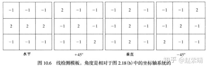 第一个模板对水平方向的线条有很强的响应;第二个模板对+45度方向线有最佳响应。模板系数为0,表明恒定灰度区域响应为0。