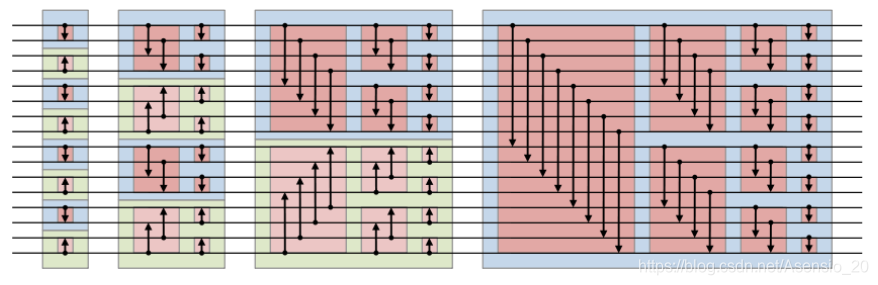 首先,我们可以看到,该算法主要的复杂度在genBitonic上面,那么这个过程是什么样的呢,可以通过下面这张图片来理解