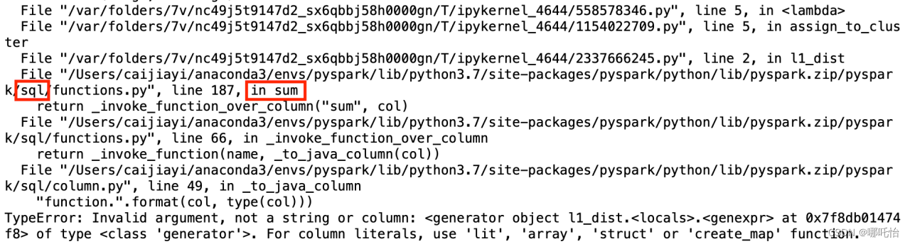 File “/site-packages/pyspark/python/lib/pyspark.zip/pyspark/sql/functions.py“, line 187, in sum 原因是我在前面导入了pyspark.sql模块,导致使用sum方法时用到sql模块中而不是正常的sum方法,出现报错。在运行分布式计算本轮迭代代价cost时,使用map方法出现如上报错,代码如下。