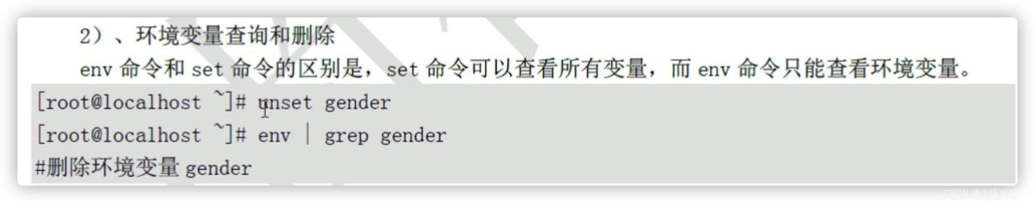 env命令可以查看所有的环境变量。unset只能删除自定义的环境变量。系统自带的环境变量无法删除。
