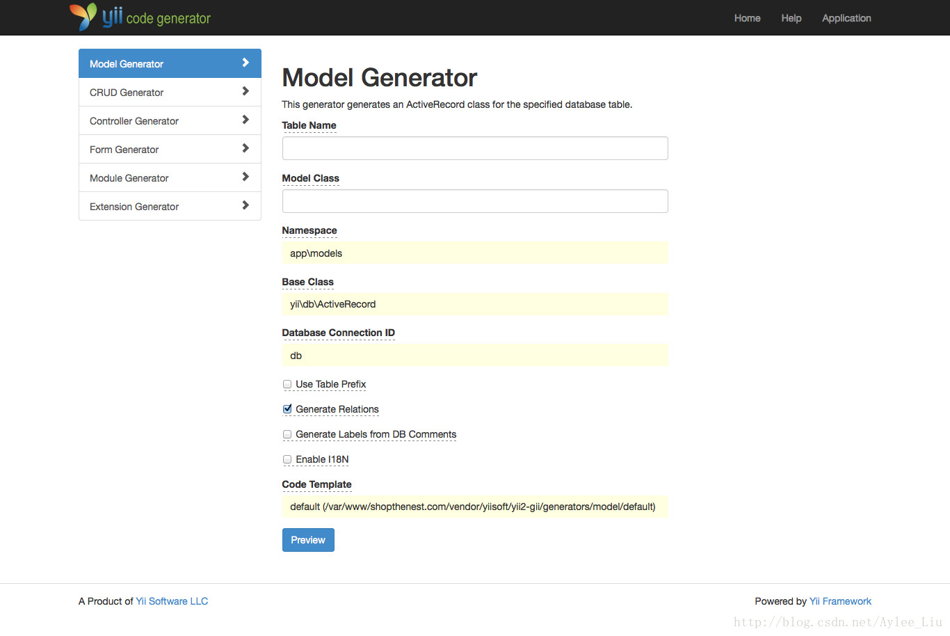 表名使用的是一个预输入控件,来试图猜测哪个表格与你的模型相关联,并且所有领域都有一个翻转工具,提示你如何填写出来。在用Gii生成它之前,你可以预览代码,并且所有代码模板是完全可以自定义的。