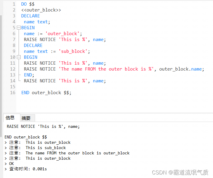 其中,DO 语句用于执行匿名块;我们定义了一个字符串变量 name,然后给它赋值并输出一个信息;